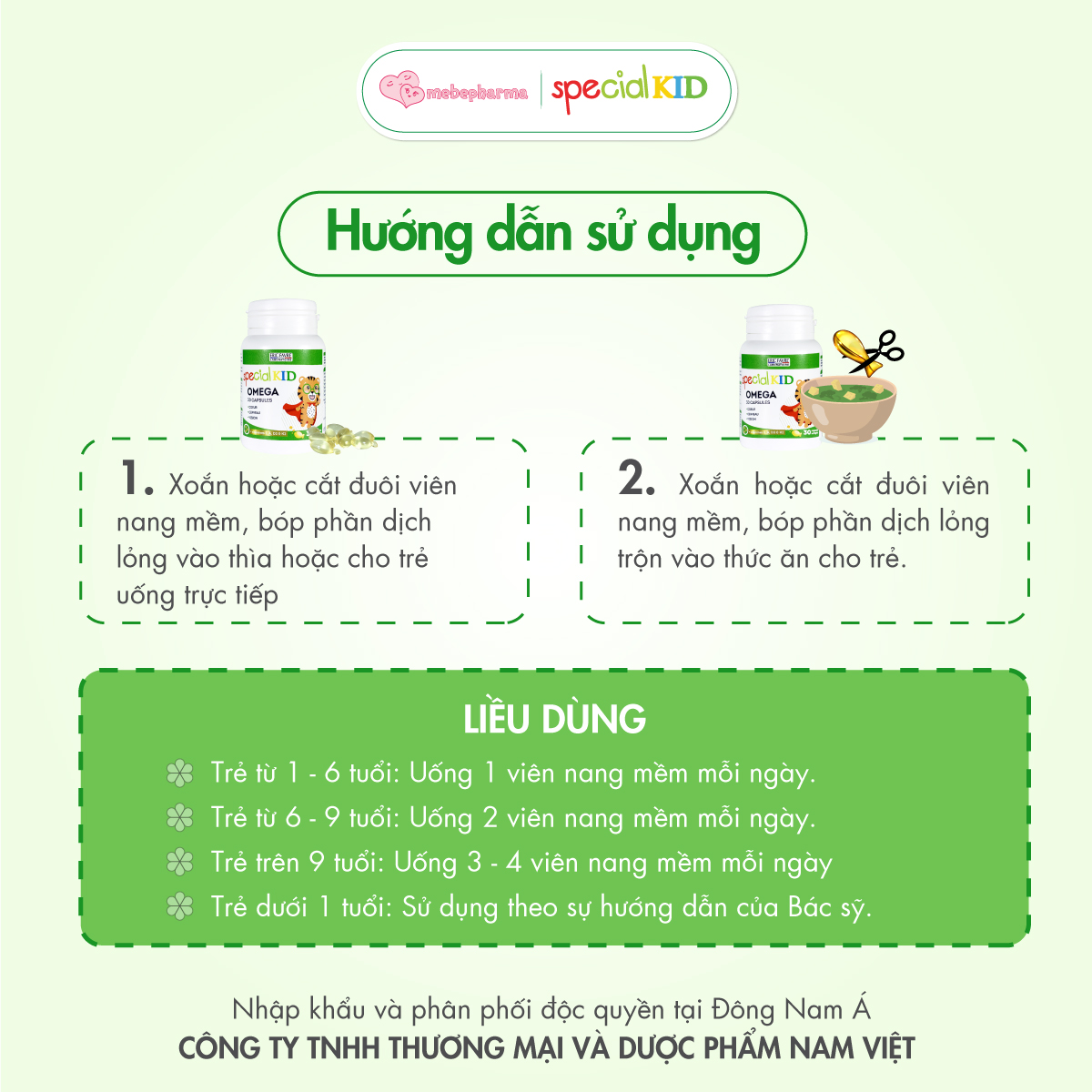 – Trẻ 1-6 tuổi: Uống 1 viên nang mềm mỗi ngày. Xoắn hoặc cắt đuôi viên nang mềm, bóp/vắt hết phần dịch lỏng vào một chiếc thìa, sau đó cho trẻ uống hoặc trộn vào thức ăn cho trẻ.